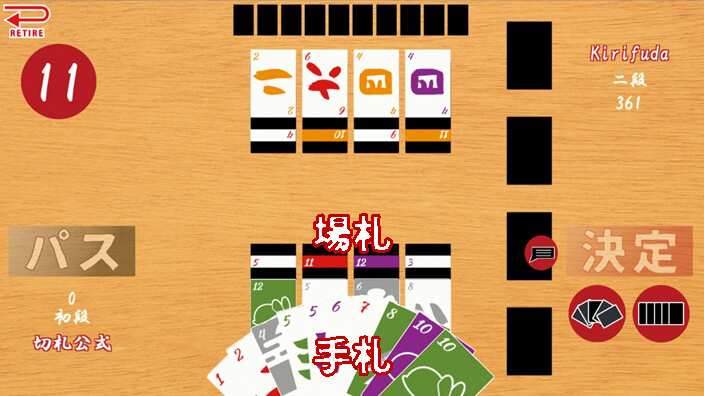 運と実力が試される変則大富豪 「切札」のオンライン版がついに登場 切札はここが面白い!  ・互いに手札の一部が見える  ・ゲーム終盤に逆転できる  ・相手の手札を見て戦略を立てられる  ・1対局5分程度 【基本ルール】 基本的なルールは大富豪と同じ。1が弱く12が一番強い。 【カードの出し方】 手札10枚に加え、相手から見える場札16枚を出し切れば勝利。 場札は4×4の裏表で並んでおり、最前のカードから出すことができる。 【特殊ルール】 ・8切り ・てんどん (革命) ・色連番  (階段) 【ギミックカード】 ・望月札  (スぺ3) ・五色札 ・大入札  (10捨て) ・切ない札 ・霞札   (8切り無効) ・暗黒札 ・うさぎ札 (ジョーカー)