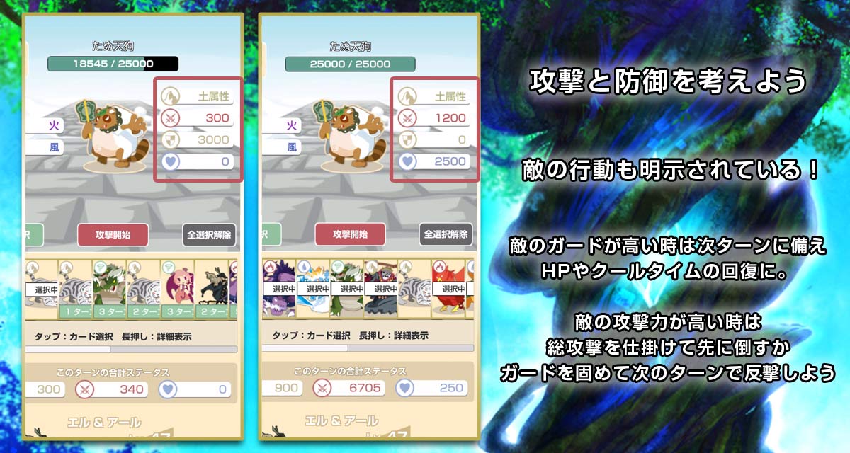 敵の行動も明示されている! 敵のガードが高い時は次ターンに備えHPやクールタイムの回復に。 敵の攻撃力が高い時は総攻撃を仕掛けて先に倒すか、ガードを固めて次のターンで反撃しよう