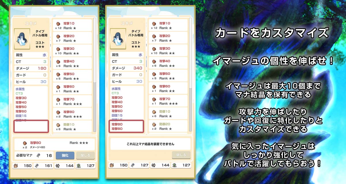 イマージュの個性を伸ばせ! イマージュは最大10個までマナ結晶を保有できる。 攻撃力を伸ばしたりガードや回復に特化したりとカスタマイズ可能。 気に入ったイマージュはしっかり強化してバトルで活躍してもらおう!