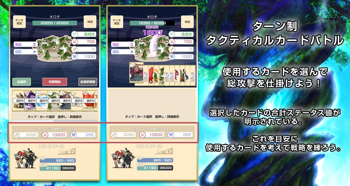 使用するカードを選んで総攻撃を仕掛けよう! 選択したカードの合計ステータス値が明示されている。 これを目安に使用するカードを考えて戦略を練ろう。