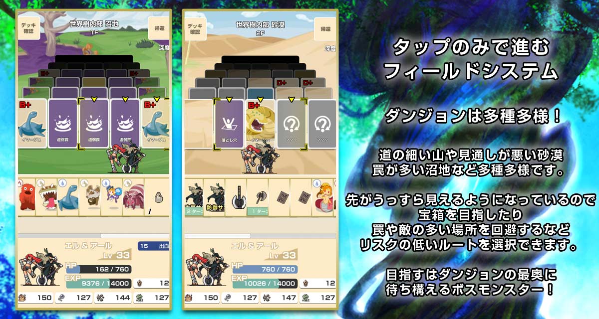 ダンジョンは多種多様! 道の細い山や見通しが悪い砂漠、罠が多い沼地など多種多様です。 先がうっすら見えるようになっているので、宝箱を目指したり罠や敵の多い場所を回避するなど リスクの低いルート選択ができます。 目指すはダンジョンの最奥に待ち構えるボスモンスター!