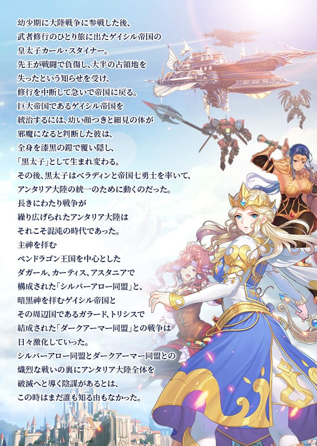 ✔ 個性あふれる英雄や巨大な魔装機と一緒に飛空艇に乗って旅を! ✔ 凶暴なモンスターとダークアーマーの勢力からアンタリア大陸を取り戻せ! ✔ 斬新な戦略MMORPGで描かれた物語を追体験し、真の主人公になろう!