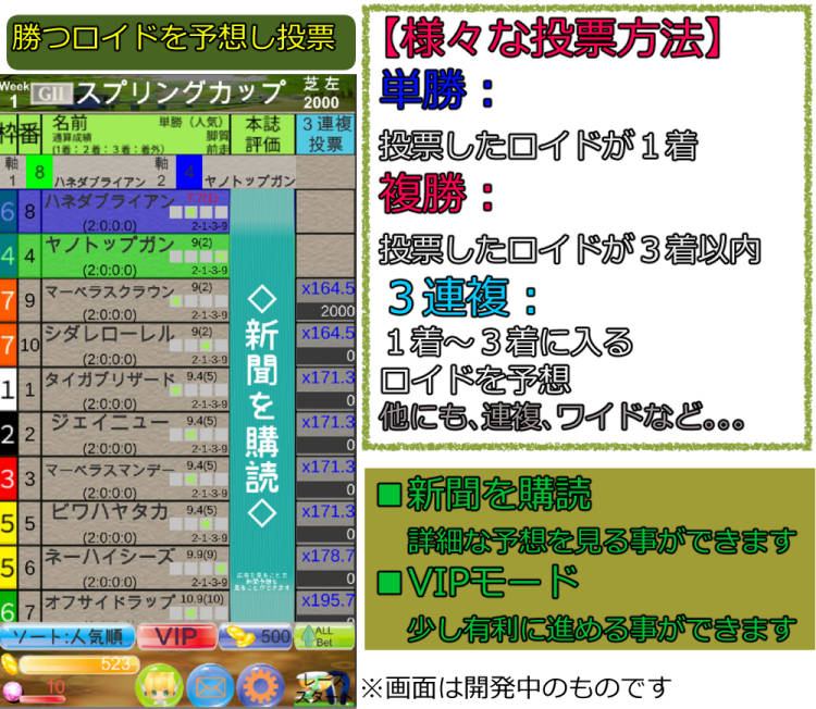 1週に1レース投票することができます。 最大16のロイドちゃんがレースをします。往年の名馬?が登場するかも? 投票方法は、単勝、複勝、ワイド~など7種類あります。 一攫千金、高配当を狙うか、地道に増やすか。どちらのプレースタイルも可能です。