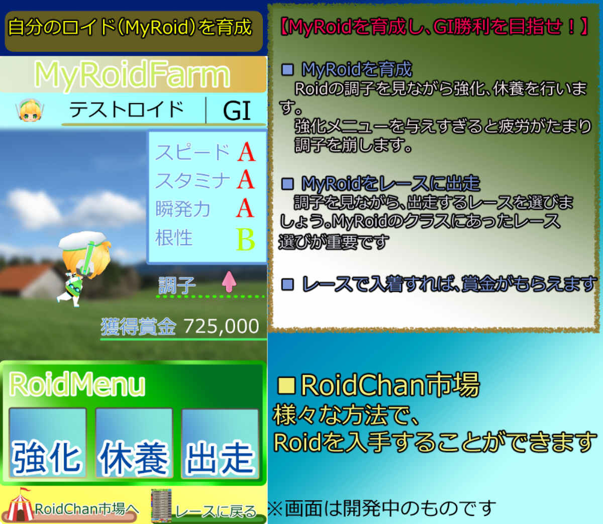 ■ MyRoidを育成 Roidの調子を見ながら強化、休養を行います。 強化メニューを与えすぎると疲労がたまり調子を崩します。 強化したい能力を考えたメニューを考えましょう! ■ MyRoidをレースに出走 調子を見ながら、出走するレースを選びましょう。MyRoidのクラスにあったレース選びが重要です ■ レースで入着すれば、賞金がもらえます レースに出走し5着以内で賞金がもらえます。 レースで1着になれば、上のクラスのレースへ出走することができます。 目指せ、GIレースの勝利! ■ネットランキング ネットランキングにMyRoidの成績を登録できます。 ・実装予定のネットワーク対戦レースにも出走させることができるようになります!