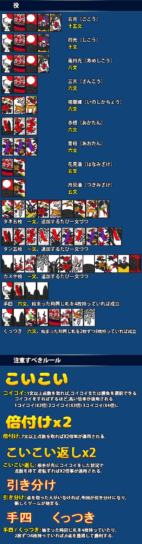 コイコイ: 1文以上点数を取れば,コイコイまたは勝負を選択できる コイコイをすればするほど,高い倍率が適用される 1コイコイ(X2倍) 2コイコイ(X3倍) 3コイコイ(X4倍) 7文以上点数を取ればX2倍率が適用される 相手が先にコイコイをした状況で点数を得て逆転すればX2倍率が適用される 点を取った人がいなければ,今回が引き分けになり,新しくゲームが始まる 始まった時同じ札を4枚持っていれば成立 始まった時同じ札を2枚ずつ8枚持っていれば成立 始まった時同じ札を4枚持っていたり,2枚ずつ8枚持っていれば,6点を獲得して勝利する