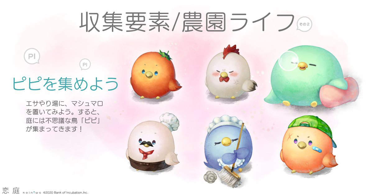 庭には、時々かわいらしい鳥たち<ピピ>が遊びにやってきます。ピピと出会うと、いいものをくれるかもしれません。
