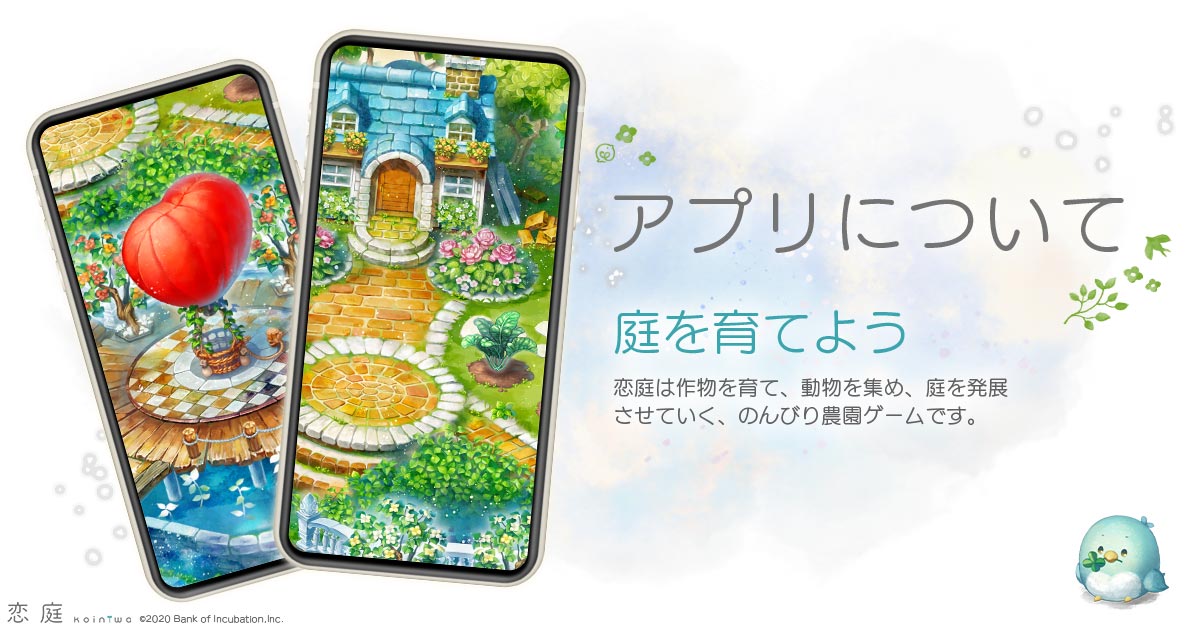 恋庭は、作物を育て、動物を集め、庭を発展させていく、のんびり農園ゲームです。 あなたが訪れた庭は、大嵐によって荒れ果ててしまっています。作物を育てながら、庭をきれいにお手入れしていきましょう。 お手入れが進むと、庭がどんどん広がっていきます。 【図鑑をコンプリートしよう】 ・作物を育てよう 種を畑に植えると、作物を収穫することが出来ます。 ユニークな作物、おいしそうな作物、かっこいい作物、愛らしい作物… 珍しい作物をたくさん収穫しよう! ・ピピを見つけよう おやつ置き場に、マシュマロを置いてみよう。 すると庭に、かわいらしい鳥たちが訪れてきます。 個性的なピピを見つけると、ピピは素敵な贈り物をくれるはずです。 全種類のピピを見つけよう! ・素材を集めよう 庭を散策していると、珍しい素材が落ちていることも… 素材を使って庭をパワーアップすることが出来ます! 作物やピピ、素材を図鑑に登録して、コンプリートを目指そう! 【庭を発展させよう】 ・庭のお手入れ すっかり荒廃してしまった庭を、お手入れしよう! 庭をお手入れすると、今まで使えなかった施設が使えるようになったり、新たなエリアに進めるようになります。 庭をきれいにしながら、便利で広い庭を目指そう! ・庭のカスタム 庭では、あなた好みのを設置したり、好きなを選ぶことができます。 あなただけの庭を作り上げよう! ・庭の強化 庭のを強化すると、珍しい作物が収穫できるようになります。 なんと、強化することで見た目が豪華になることも! 【ファッションを楽しもう】 ・多彩なブランド 恋庭の世界には、たくさんのファッションブランドが存在します。 シンプル・キレカジ・スポーティ・アメカジ・英国スタイル… 様々なブランドのアイテムを身に着けて、あなただけのファッションを見つけよう! ・多彩なキャラメイク 目の大きさ・まぶた、口の大きさや鼻の形など、細かいキャラメイクが可能です。 あなたそっくりなアバターを作ることが出来ます。 ・ファッションコンテスト 恋庭の世界では、ファッションコンテストが開催されます。 あなたのファッションを世界に発信するもよし、他の人のファッションを参考にするもよし、目一杯ファッションを楽しもう! ※フレンドと交流が行えるマッチング機能が実装されているため、対象年齢は18歳以上となります