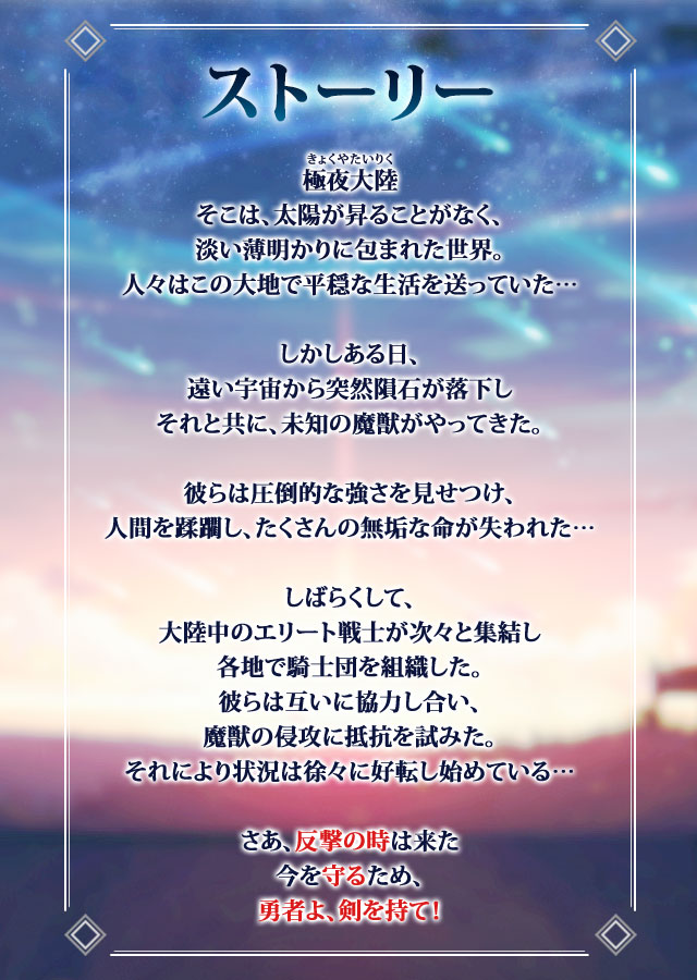 縦持ち X 放置のMMORPG新作! 薄明りに包まれたこの大陸。人々を、世界を守るために立ち上がれ! この大陸で伝説を作れ!