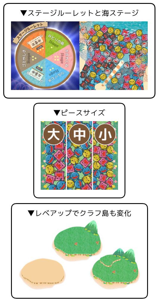 クラフ島をペラペラにしてしまったフレキソウイルスをなぞって消していくパズルゲームです。 初めにルーレットで多彩なパズルステージを決定し、制限時間(60秒)以内に「同じ色のピース」を2つ以上つなげて消していきます。消したウイルス数に応じてクラフ島は元に戻っていきます。 可愛いピースはサイズを3段階に設定可能なので、小さいお子様でも簡単にプレイできます。