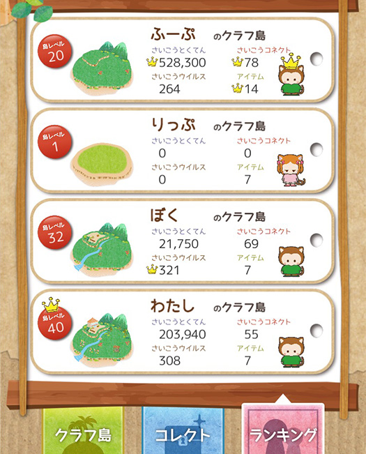 一般的なソーシャルゲームとは異なり、1つの端末に4人までデータを保存でき、複数人でゲームを進められます。全員のスコアも一覧表示可能で、家族内でのランキングも楽しめます。