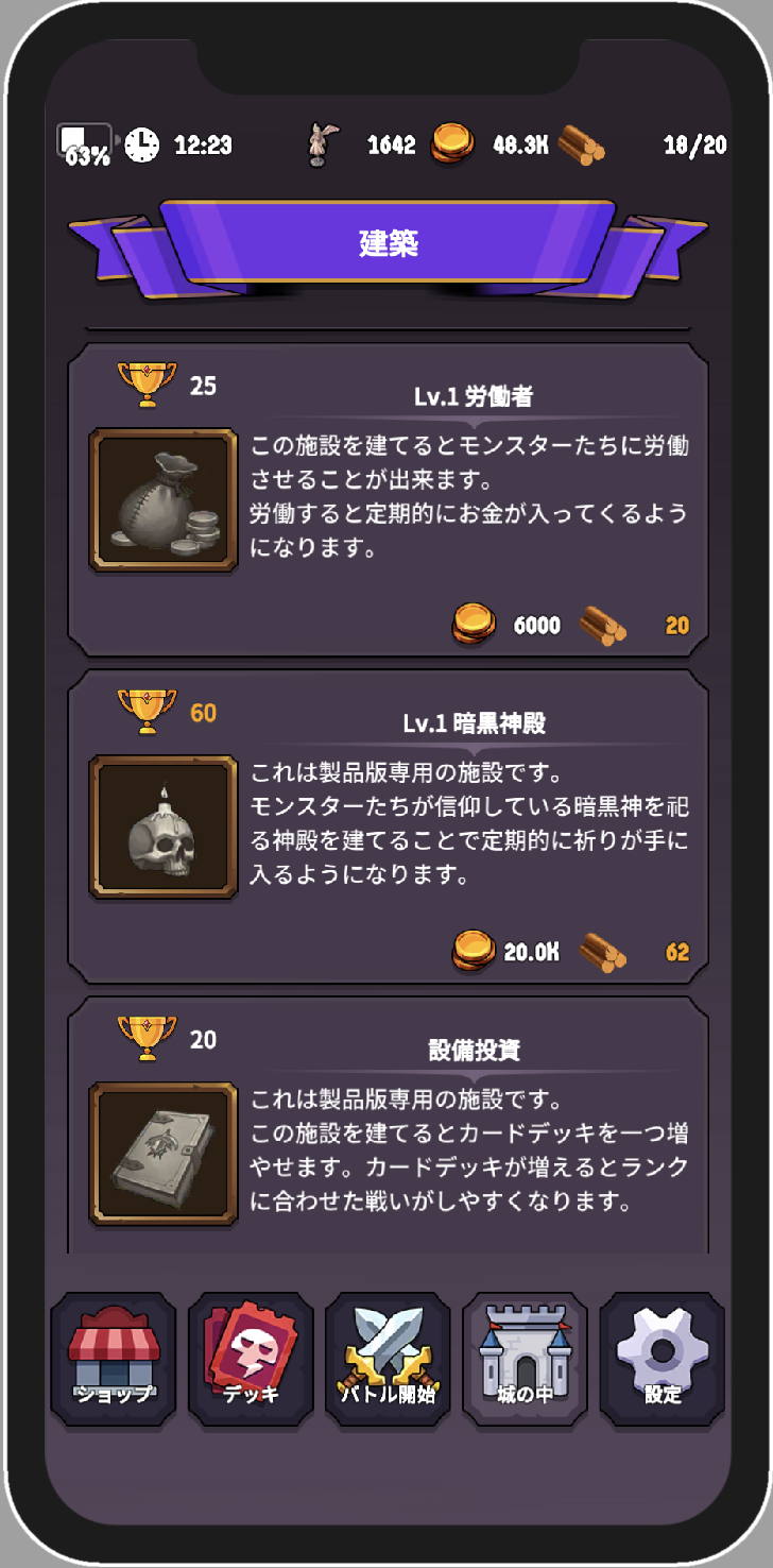 様々な建物を建てることでカードを集める事が楽になっていく。 ゲームをやっていない時にもお金を稼いでくれる労働者を雇えばゲームを遊ぶたびにカードを購入できるそ!