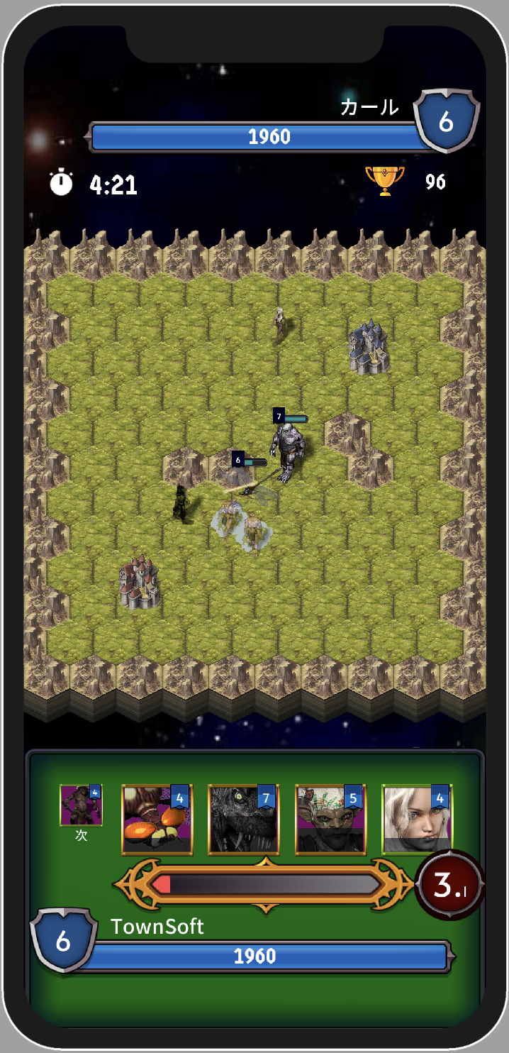 下から召喚するモンスターを選択して、城の近くをタップすればモンスターを召喚できる。 召喚されたモンスターは敵の城を落とすために自動的に進んでいく。 道中で敵と遭遇したら戦闘の開始だ!