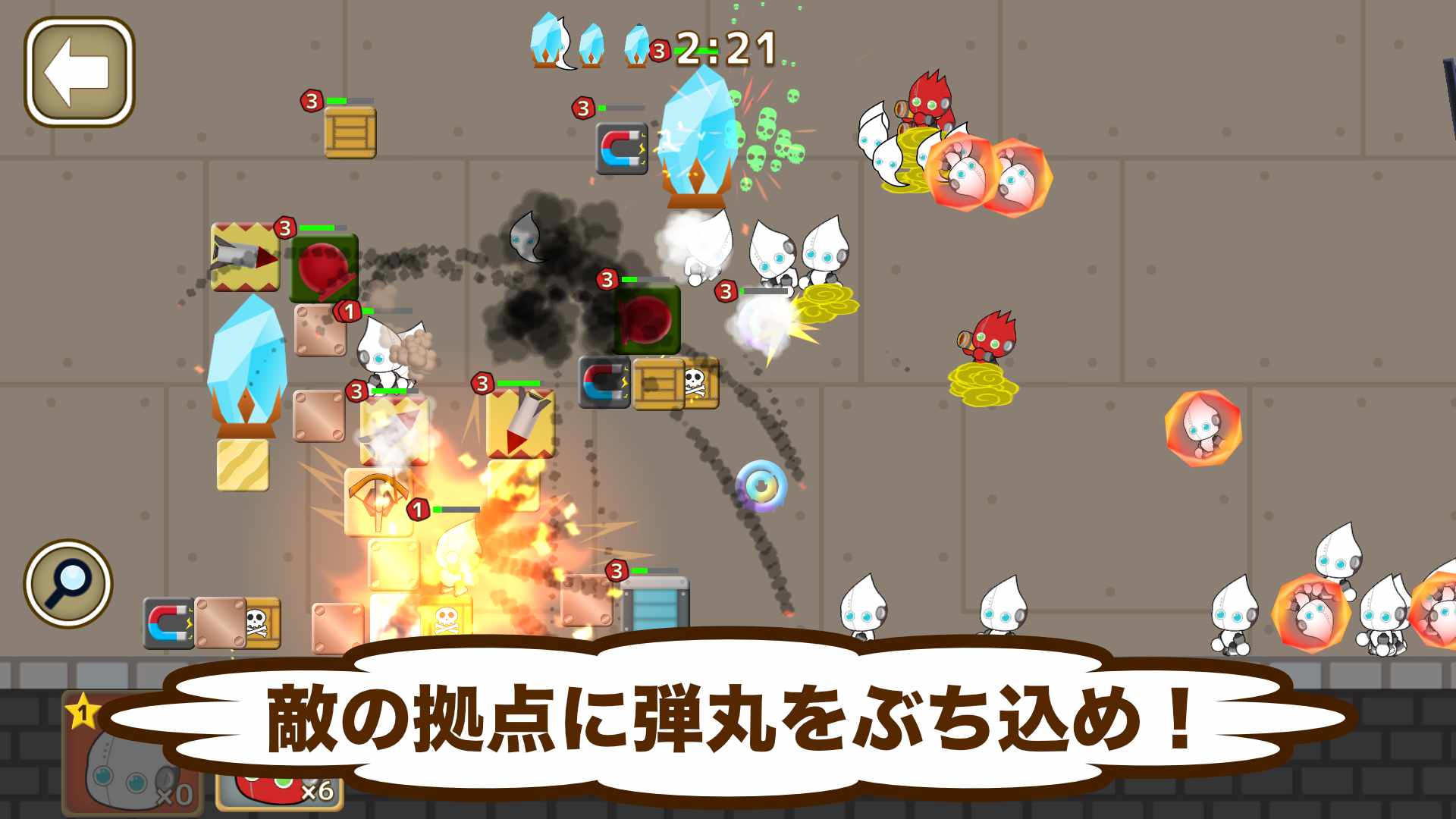 ユニットは弾丸になって敵の拠点に攻撃しにいきます。 壁ブロックを狙ってうまく破壊しましょう!