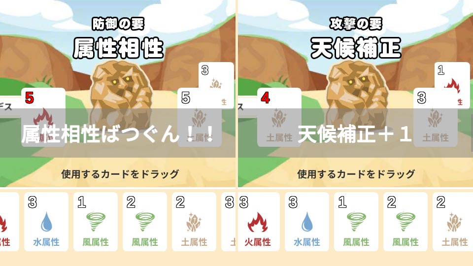 守りの要である属性相性と攻撃の要である天候補正を上手く使うとバトルを有利に進められます。 属性相性が良いと数字が低くても、相手のカードと同数まで数字が上がりダメージを受けません。つまり無敵。 天候に合ったカードを出すと数字が+1されるので、相手の山札をより多く削れるようになります。 どちらもプレイヤー側にのみ適応されるので、属性相性と天候補正を活用し、バトルを優位に進めましょう。