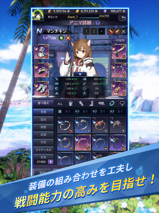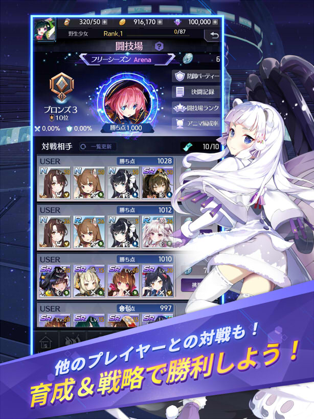 育成したアニマたちは、他のプレイヤーの部隊とも戦闘可能!もちろん戦闘力だけではなく、戦略や編成も勝敗に影響する!アニマたちと闘技場の覇者を目指そう!