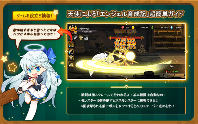 ステージ進行と戦闘はすべて自動! 次々とやってくる敵を倒すと、ボスが登場する。 ボスとの1対1対決で勝利すると次のステージへ!