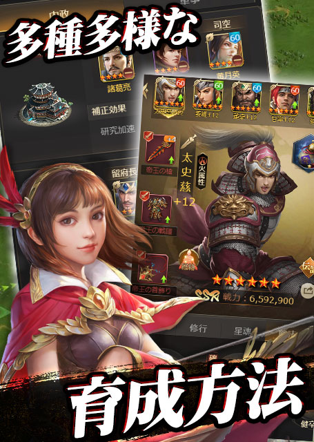 様々な育成方法が存在し、自由に強化することが可能!武将自身の強化はもちろん、スキルや技術の研究、さらには特別な装備や兵種など、やりこみ要素はかなり豊富です。お気に入りの武将をあなた好みに成長させ、あなただけの軍を創り出しましょう!
