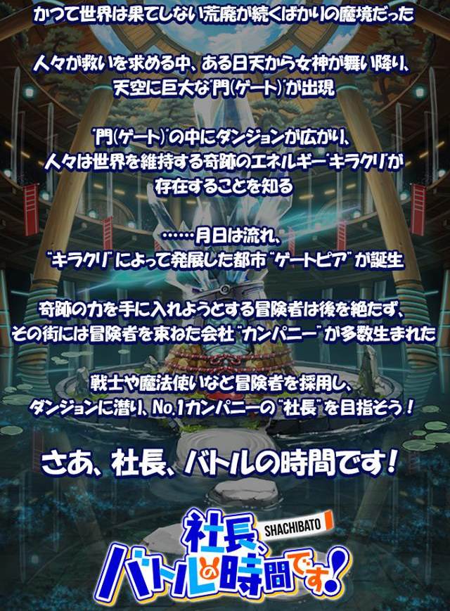 『社長、バトルの時間です!』は、やりこみ要素満載の異世界シミュレーションRPG。4月のTVアニメ放送にあわせてゲームの大幅パワーアップを予定している。プレイヤーは「社長」となり、「冒険者(社員)」を雇ってモンスターが巣食うダンジョンを攻略しよう。ダンジョンに潜る冒険者は、「社員育成」と呼ばれる育成モードで「戦士」や「魔法使い」といった職業を選択可能。各冒険者のパラメーターを自由自在に設定し、あなただけのキャラクター育成ができるぞ!