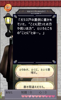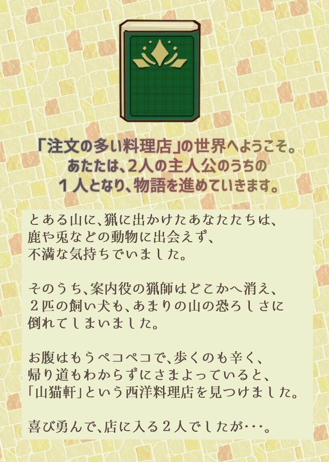 注文の多い料理店ではいくつもの扉が出てきます。 登場人物の一人であるあなたは、扉の前で選択を迫られます。 「扉を開ける」か「ちょっと待った」のどちらかを選びます。 「ちょっと待った」を選択すると、問題が出てきます。 問題に正解して、知識と心を増やしてください。 本編はマルチエンディングとなっています。 知識と心ポイントの多さによって、登場人物を良いエンディングへと導いてください。