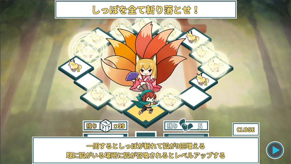 一周するとしっぽが斬れて狐が9匹増える 既に狐がいる場所に狐が召喚されるとレベルアップする