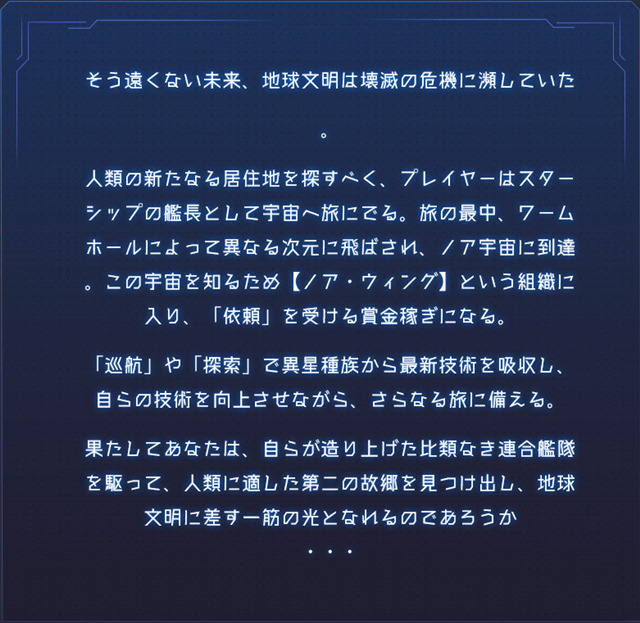 壊滅の危機に直面した地球の文明を救うべく、人類の新たな居場所を探しだす旅へ! 簡単なのに奥深い、宇宙開拓放置系SLG! 今なら、事前登録受付中! ガチャ60連と最高レアの艦長が手に入るかも!? 指揮官の皆様、ぜひご参加ください! ■ノア宇宙戦記の特徴 【シンプルな操作性!気軽にゲームプレイ!】 ・フルオートバトルで誰でも簡単にプレイできる! ・放置するだけで大量の金貨、経験値など様々な素材をゲット! ・オフライン中でも艦長たちはどんどん強くなる! 【たくさんの魅力的な艦長たち!】 ・個性豊かな艦長たちが貴方の艦隊を強力にサポート!艦長たちの育成も忘れずに! ・お気に入りの艦長を集めて、最強艦隊を編成しよう! 【やり込み要素が多い戦闘システム!】 ・装備やスキル、僚艦など…戦闘のスタイルは自由自在! ・特定のキャラを揃えて連携技を発動!様々な組み合わせがバトルの勝敗を左右する! 【豊富なコンテンツを遊び放題!】 ・一人でも楽しめる!ワームホール、競技場、商会任務など遊べるコンテンツがいっぱい! ・陣営に加入し仲間を見つけ、惑星争奪戦で資源を収集!仲間たちと戦いに備えろ! ■世界観 そう遠くない未来、地球文明は破滅の危機に瀕していた。 人類は新たな居場所を探すべく、あなたはスターシップの艦長として宇宙へ旅に出る。 そんな旅の最中、ワームホールによって異なる次元に飛ばされてしまう。たどり着いたのは、ノア宇宙という場所であった。 この宇宙で生き抜くために【ノア・ウィング】という組織に入り、「依頼」を受ける賞金稼ぎになる。「巡航」や「探索」で、あなたは多くの異星種族の艦長たちと出会い、様々な事件に巻き込まれながらも絆を深めてゆく。そして地球侵略の真相を解き明かしていくことに… ■推奨環境 iOS 9.0以降/Android OS 8.0以降
