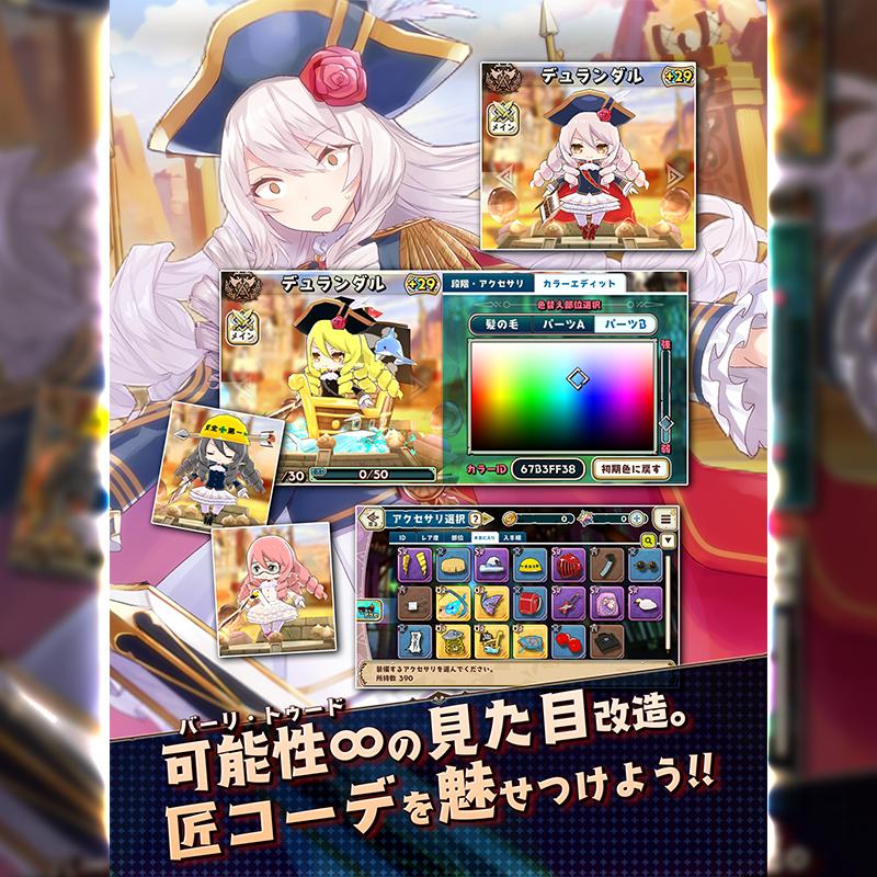 日替わりで店に並ぶアバターアクセサリで着飾れる! キャラゲー業界の掟破りカラーカスタマイズ機能も搭載! あなただけの見た目にカスタムした武姫で戦場に駆り出そう!