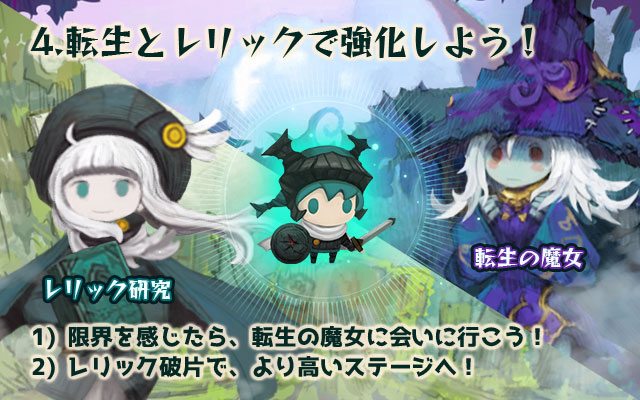 * 限界ステージに辿り着けば転生の魔女を通してファーストステージに戻ってください。 * 転生をすればゴールド・ルナ・仲間のレベルが初期化されますが、チームレベルがアップして遺物のかけらがもらえます。 * 遺物のかけらを使って様々な効果を持っている遺物がもらえます。 * 遺物の能力を使ってより高いステージに辿りついてみてください!