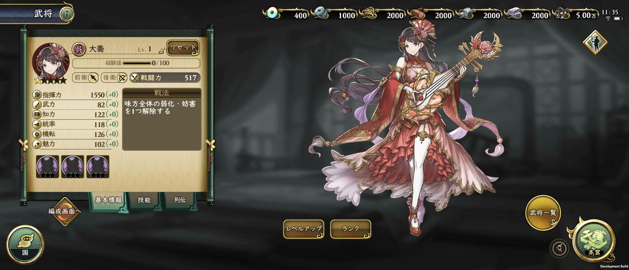 リリース時点で、全80人以上の武将が登場予定!しかも自分の好きな武将が育成できる! 豊富な種類の武器・防具・装飾品を組み合わせて、武将の戦力をあげよう。 部隊は前衛後衛にわかれており、編成の幅は無限大! あらゆる工夫を盛り込んで、自分だけの最強部隊を編成しよう。