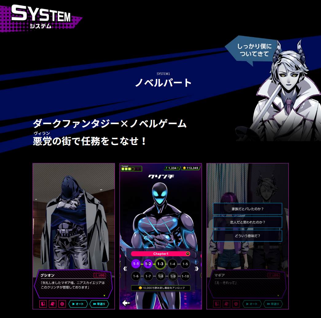 物語は主人公が犯罪組織「ヴァーテックス」に足を踏み入れるところから始まる。 ともに行動するキャラクターを選び、話を読み進めよう。時々出現する選択肢によって、エンディングが分岐するぞ。 (公式サイトより引用)