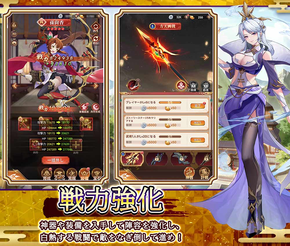 神器や装備を入手して陣容を強化し、 白熱する戦闘で敵をなぎ倒して進め!