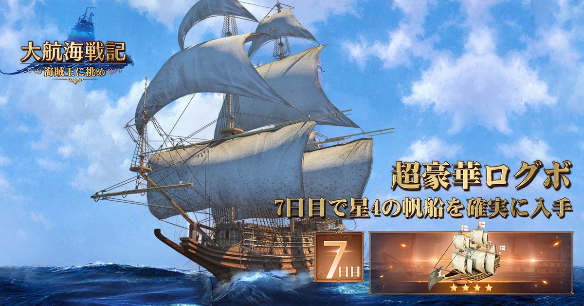 超豪華なログインボーナス!今すぐダウンロードすれば毎日様々なアイテムが手に入る!さらに7日目達成で星4の帆船をゲット!