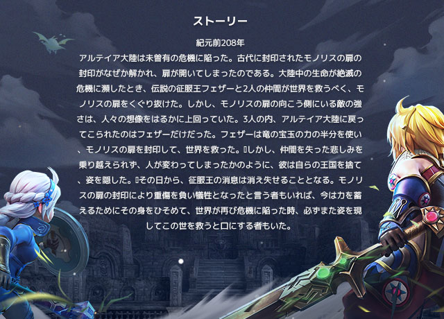 無料MMORPG『ドラゴンネスト2:エボリューション』の事前登録が全世界同時に始まりました。この機に、すでに3億人以上のプレイヤーが体験した壮大なファンタジー世界での冒険を、新規プレイヤーの方々もぜひお楽しみください。 偉大なる冒険者のみなさん!女神アルテイアの呼び声を耳にしたのなら、運命と使命を共に記し続けるために戻ってきてください! アルテイア大陸は崩壊の瀬戸際にあり、女神はみなさんの帰還を待ち望んでいます! 竜の谷の創造者である女神アルテイアは、姉妹であるベスティネルに毒を盛られ深い眠りに落ちてしまいました。その睡眠の最中に生まれたのが、アーチェリンの世界です。侵略者のシャドウによって、この大陸は荒廃し、住人たちの生活はめちゃくちゃになってしまいました。人間は利己的に欲望のままに振舞うようになり、この純然たる土地はかつてない災厄に見舞われています。冒険者一行がこの場所に現れ、ドラゴンと戦い、女神を眠りから覚ます力のある石を見つけるまでこの状況は続くでしょう。女神を目覚めさせ、世界を救ってください。 覚えているでしょうか。13年前の出来事を。今再び、竜の谷大陸が巨大な竜の攻撃を受けており、幸せの土地が崩れ去ってしまいました。みなさんが寝ている間に、女神の呼び声を耳にしました。冒険者よ、どうか戻ってきていただけませんか!再び、この世界を闇から救ってください。 アルテイアは、みなさんとその友人が帰還し、邪悪な生物が世界を破壊するのを食い止め、若い命をみな救ってくれると期待しています。 全4種類のクラスが用意されているため、プレイヤーは最適なプレイスタイルを十分な数の選択肢から選ぶことができます。ダンジョンはソロで攻略することもできますが、4人か8人のグループで挑戦することも可能です。ワールドボスを倒し、希少な報酬を獲得するにはプレイヤー全員の協力が不可欠になるでしょう。