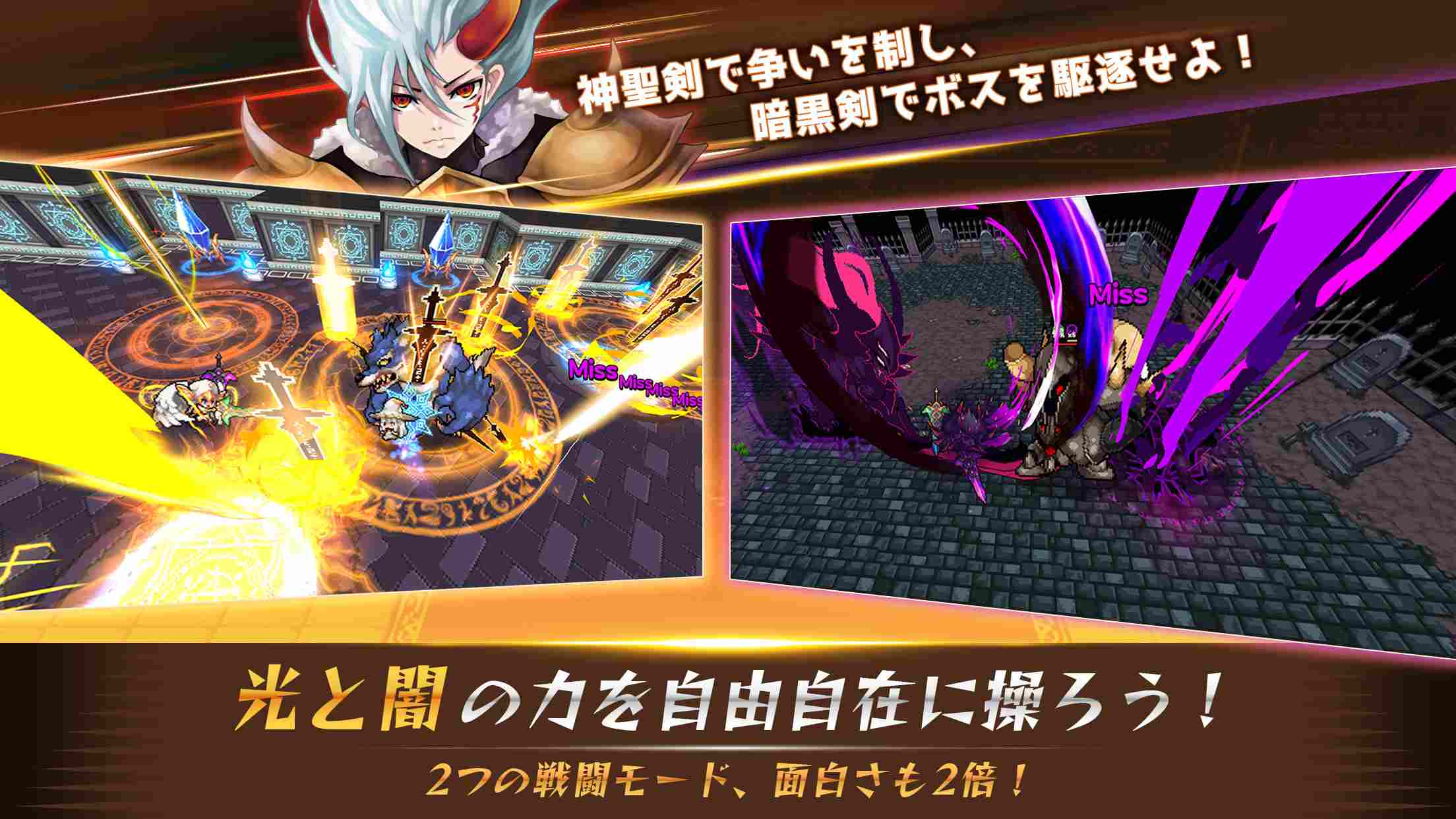 聖剣で戦場を支配し、暗黒剣でボスを構築せよ! 好きなように戦闘モードを変えて、もっと効率的に成長しよう!