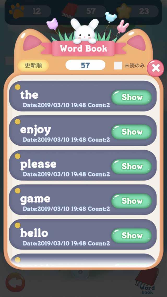 ゲーム内で作成した英単語は、ゲームの英単語帳に保存されるよ。 いつでも、和訳を確認できるので、復習にとっても便利♪