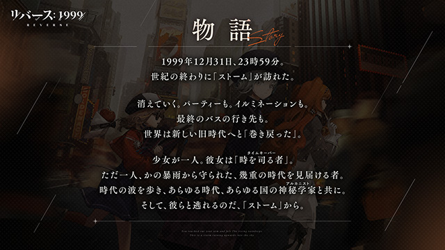 『リバース:1999』(2023) 制作:BLUEPOCH 主演:ヴェルティ(あなた)、ソネット、レグルス、その他 ジャンル:世紀末タイムリバースRPG 言語:日本語 / 英語 ◆ あらすじ 1999年最後の日、とある「ストーム」が空に降りかかった——通行人、建物の壁は雨水に溶けて剥離され、世界は新しい旧時代にやって来た。あなた以外の者は、全員「ストーム」に侵蝕され行方不明になった。人間と神秘学家(アルカニスト)が共存するこの世界では、「マヌス・ヴェンデッタ」という団体が存在する。彼らは神秘学(アルカナム)の栄光を復興するため活動しており、「ストーム」の発生と何らの関係があるようだ。 ヴェルティ(出演 あなた)はストームの影響を受けない存在として、神秘学家を収容する組織「聖パブロフ財団」から「タイムキーパー(時を司る者)」に任命される。そして「ストーム」によって変化する時代を往来し、助手のソネットと共に様々な時代と国にいる異変の兆しに気づいた神秘学家の仲間たちを見つけ、彼らを連れて「ストーム」から脱出する。彼女の身世、「ストーム」の真相、組織の目的…全ては雨幕によって妨げられているかのようで、はっきりとしない。 ◆ 出演者 ヴェルティ(出演 あなた) CV:高森奈津美 ソネット CV:内田秀 レグルス CV:山本希望 APPLe CV:平川大輔 ドルーヴィスⅢ CV:石川由依 サザビー CV:伊藤美来 X CV:土岐隼一 シュナイダー CV:悠木碧 アルカナ CV:小清水亜美 ミュオソティス CV:諏訪部順一 など ◆ 見どころ □ スクリーンで上映される新しい20世紀 「ストーム」後の世界は歴史という存在を超越し、かの時代の出来事が目の前で展開される。ダイナミックな演出と心を魅了する音楽で、没入感のある視聴体験を編み出す。 □ スペルを唱え、アルティメット儀式を召喚 神秘術(アルカナム)の効果は、術者自身だけでなく攻撃対象、スペルを唱える順序などに影響される。一部の神秘学家はより高いランクの神秘術と特定状況でのみ召喚できる「アルティメット」の儀式を生涯の研究課題にしている。 □ 種族や時代を超えて、神秘学家たちと出会う 人々は神秘学家を様々な名で読んできた:魔女、黒魔術使い、怪人…彼らはクールな貴族の淑女であったり、親切なカフェーの女給さんであったり、明るいロックガールであったりするし、カカシ、リンゴ、テレビ…ましてや鏡の欠片であったりもする。 □ 自由に建造、荒原も緑に溢れる 荒原「ウィルダネス」は外の世界から邪魔されない、時間が固まったかのような空間。島と湖を繋げ、建物を配置すれば、孤島も大陸になれる。「神秘学家」たちと共に、ここでのんびりとした時間を過ごそう。 □ 日本語吹き替え版の豪華声優陣(五十音順) 愛美、生田輝、石川由依、伊藤彩沙、伊東健人、伊藤美来、上田麗奈、内田秀、内田真礼、内山昂輝、小澤亜李、小田島風美、神咲茉希、上高涼楓、川澄綾子、喜多村英梨、木野日菜、工藤晴香、小清水亜美、小西真以、小原莉子、榊原優希、佐倉綾音、佐藤文哉、清水咲真、洲崎綾、鷲見友美ジェナ、諏訪部順一、高垣克央、たかはし智秋、高森奈津美、橘ゆき、田中敦子、田中ちえ美、田中理恵、紡木吏佐、東山奈央、土岐隼一、鳥羽優好、永塚拓馬、新田京助、野口瑠璃子、野津山幸宏、花江夏樹、速水奨、平川大輔、ファイルーズあい、福原安祥、堀川かえで、本渡楓、前川涼子、松田颯水、水瀬いのり、麦穂あんな、矢田耕平、山本希望、悠木碧、優月和香、Liyuu、若山詩音