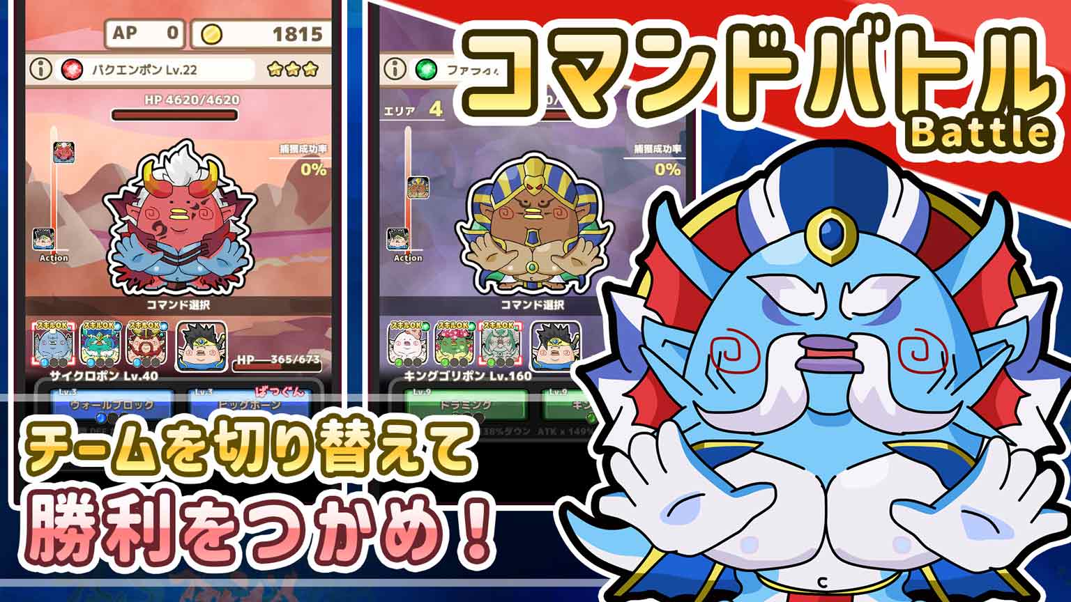 バトル中にチームを切り替えられるぞ! うまく切り替えてバトルを有利に進めよう!