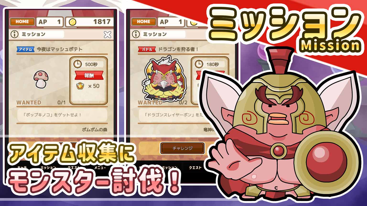 ミッションには「モンスター討伐」と「アイテム収集」が存在するぞ! いろいろなミッションに挑戦しよう!