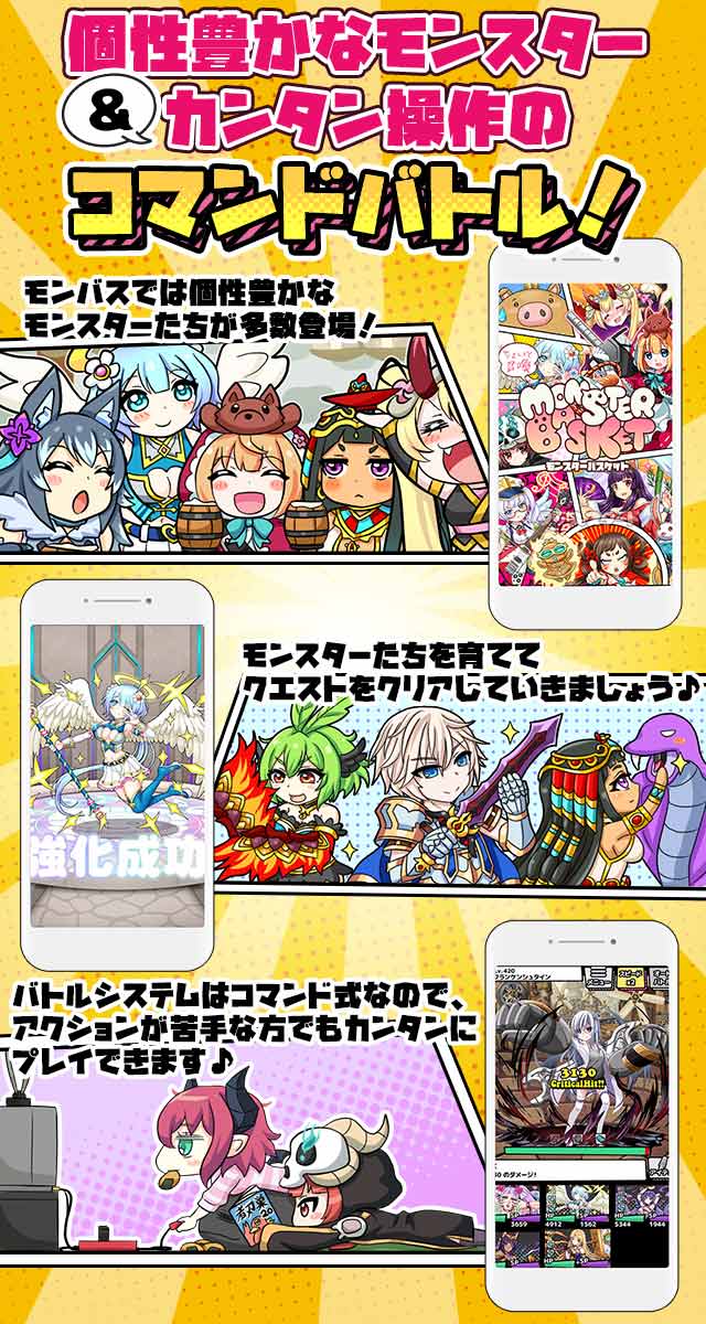 モンバスでは個性豊かなモンスターたちが多数登場! そのモンスターたちを育ててクエストをクリアしていきましょう♪ クエストは敵モンスターと戦うことで進んでいきますが、バトルシステムは コマンド式なので、アクションが苦手な方でもカンタンにプレイできます♪