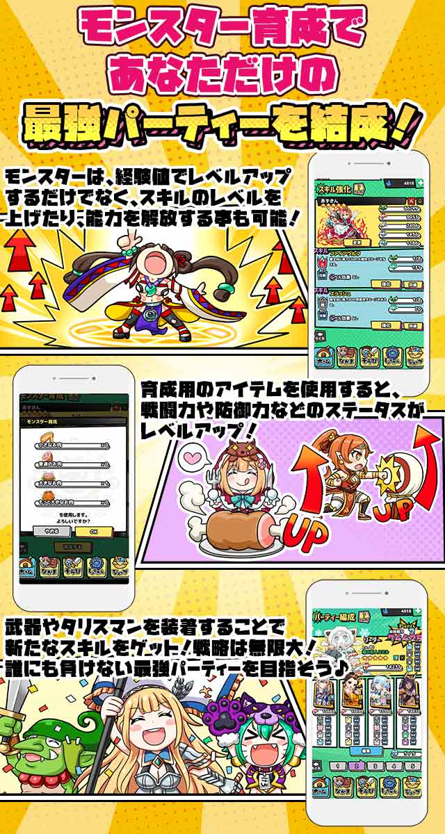 自分のモンスターは、敵を倒して経験値を貯めていくことでレベルアップしていくだけでなく、 スキルのレベルを上げたり、能力を解放したりすることもできます。 また育成用のアイテムを使用すると、アイテムにより戦闘力や防御力などのステータスがアップするので、どんどんアイテムを使って鍛えていきましょう♪ それ以外にも、戦闘を有利に進められる武器を装備したり、タリスマンを装着することで新たなスキルをゲットすることもできるので戦略は無限大! 誰にも負けない最強パーティーを目指しましょう♪
