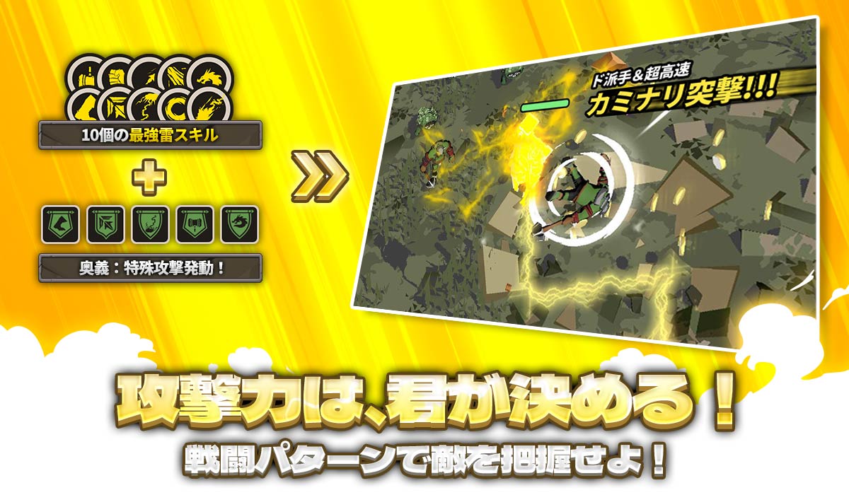 迫力&スリル満点の雷スキルと特殊攻撃のハーモニー!自分だけの組み合わせで、戦略的に敵を駆逐せよ!