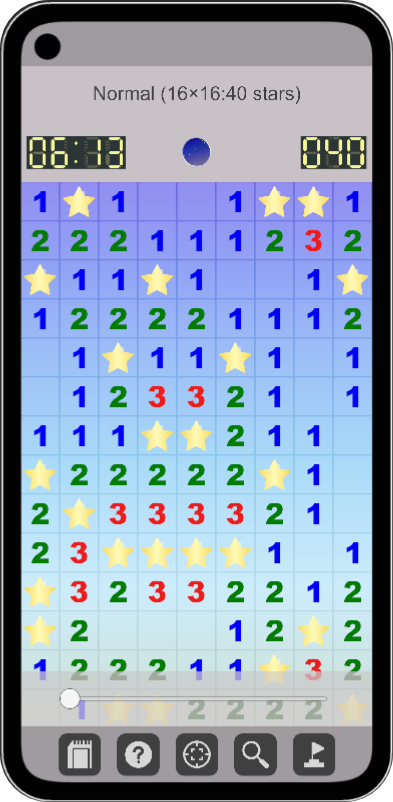 1.以下の五段階のレベルから好きなレベルを選び、ゲームを開始します。   前回の保存データから始めたい人はContinueボタンを押します。 【レベル】 ・Easy (9×9マップ : 10個のStar) ・Normal (16×16マップ : 40個のStar) ・Hard (30×16マップ : 99個のStar) ・Super (48×24マップ : 256個のStar) ・Hyper (48×48マップ : 512個のStar) 2.必ず論理的に解けるマップが生成されます(運ゲーなし)。 3.論理的に解けると確信したマスをクリックで開き、   星があると判断したところには旗を立てることができます。 4.星ではないマスをすべて開いたらクリアです!