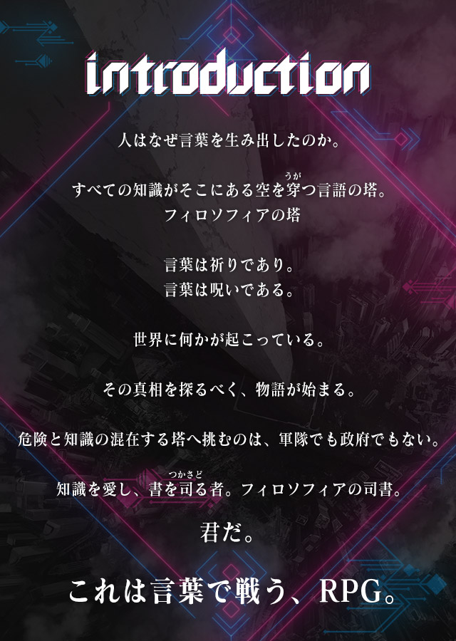 『ことばのパズル もじぴったん』『冒険クイズキングダム』といった大ヒットゲームの生みの親として知られる後藤裕之ディレクターが新たに手がける言葉のパズルは、スクウェア・エニックスで数々の人気ゲームを手がけ、『ゲームDJ』として株式会社シシララの代表取締役社長を務める安藤武博プロデューサーとの強力タッグで本格RPGへと進化。 シナリオ・虎走かける×キャラクターデザイン・タイキ×音楽・景山将太ら豪華クリエイター陣が創り出すドラマチックな世界観の中で、『クロス×ロゴス』の物語は始まります。 【スタッフ】 シナリオ:虎走かける(『ゼロから始める魔法の書』シリーズ) キャラクターデザイン:タイキ(『LORD of VERMILION IV』/『Fate/Grand Order』) 音楽:景山将太 ディレクター:後藤裕之(『ことばのパズル もじぴったん』シリーズ) プロデューサー:安藤武博(『拡散性ミリオンアーサー』) 開発:カヤック×カヤックアキバスタジオ 配信:アニプレックス×カヤック 【主題歌】 藍井エイル「voyage」(SACRA MUSIC) 【キャスト】 主人公(男):石川界人 主人公(女):瀬戸麻沙美 エルス(男):代永 翼 エルス(女):村瀬 歩 ココ:潘めぐみ 地竜:稲田 徹 柘榴:高橋李依 コロンバイン:田村奈央 ヒュパテア:たかはし智秋 トントン:竹達彩奈 コロナ:東山奈央 AND MORE... ©Aniplex Inc. / KAYAC Inc. All Rights Reserved.