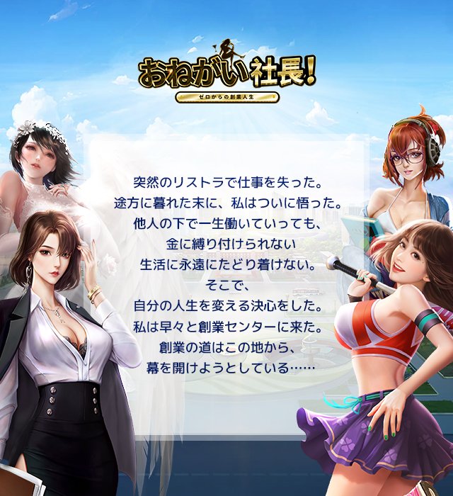 大型アップデート限定イベント「雪祭り」間もなく開催!ダイヤ*500無料ゲット! ※限定イベント期間:12月1日~12月7日 限定イベント期間中、新しいUR人材登場!新たな人材衣装を追加! ※新機能「料理屋」を実装! 世界中の料理を味わってください! 他にも様々な限定企画が用意されるので、お見逃しなく~ ※イベント期間、内容は予告なく変更する場合がございます。 やり方が手軽で、豊富なモードで満喫できる本格的な会社経営シミュレーション。プレイヤーはゼロから起業し、財産を積み上げ、自分だけのビジネス帝国を作り出せる。運命を塗り替えて、人生の勝者になっていこう! ■ゲーム概要 【素敵な女性がたくさん】 若々しく元気なアイドルガール、魅力的なおかみ、優しくて思いやりがるOL。個性豊かな彼らがあなたの採用が待っている。金と美女、両方を手に入れてこそ、最高の人生の証である! 【リアルな世界で、高級車を体験】 高級車こそ男のロマンスなのだ! 勝ち組の人に欠かせない各式豪華な高級車を体験できる。さらに車の改造も思うままに。自分だけ唯一無二の車を作り出そう。 【仕事は美人秘書を任せて】 社長となれば欠かせないのはもちろん敏腕な秘書。きめ細かで優しい彼女たちは会社でのあらゆる業務を扱ってくれる。問題なら、彼女たちを任せよう! 【人材育成、商談、買収など多様なモードを搭載】 好みの人材を育ち、知恵を生かして他の経営者と商談し、さらに他社を買収することで、自分の会社の規模をどんどん拡大していく。今すぐあなただけのビジネス帝国を築ごう! 推奨環境:iOS8.0以上,Android5.0以上