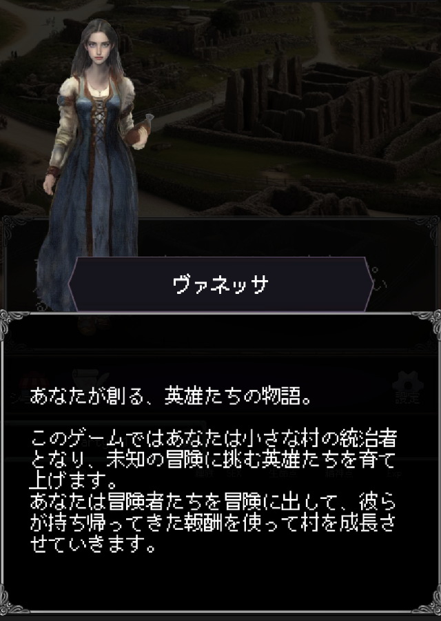 あなたが創る、英雄たちの物語。 (閏日に配信予定です!) このゲームではあなたは小さな村の統治者となり、未知の冒険に挑む英雄たちを育て上げます。 冒険者たちが持ち帰ってきた報酬を使って村を成長させます。 -- 冒険へ まずは村人たちが集まり冒険者が誕生する酒場や装備を整えるための武器屋・防具屋を建てましょう。 そして外の世界へ旅立つ準備ができたら、彼らを冒険に送り出しましょう。 冒険者たちは自分たちの意志で冒険を進めてくれますので、冒険中はアプリを閉じていても大丈夫です。 -- 冒険の後 冒険者たちが無事に帰還したら、彼らの冒険譚を聞きましょう。 彼らはきっと、その話をすることを楽しみにしています。 そして、彼らが持ち帰った報酬を使い、村を発展させていきましょう。 冒険者たちも、その成長を楽しみにしているはずです。 -- 冒険者たちの成長 村が成長すると、冒険者たちにより強力な装備を渡せます。 また、剣技や回復術、地図作成などの技術を彼らに教えられます。 遠くの地への冒険に必要な保存食や、暗闇を照らす明かりも準備できるようになります。 -- 村で出来ること 村の人々は冒険のために協力を惜しみません。 傷ついた冒険者の傷を癒やしてくれるでしょう。 今まで冒険した記録を街に残しておいてくれるでしょう。 冒険者のために世界中の遺跡を探しに行ってくるでしょう。 強敵との戦いのために様々な戦術を考えてくれるでしょう。 ・・・ただ、それらを行ってもらう代わりにあなたは資金が必要になりますが... 今、新たな英雄たちの物語が幕をあける。 Agent of Adventureシリーズの第三弾として、新たな冒険があなたを待っています。 ※過去のシリーズとの直接的なつながりはないので過去作を知らなくても楽しめます。 ※このゲーム内で出てくる名称はほとんど変更できますので、あなただけの世界観を作ることが出来ます。