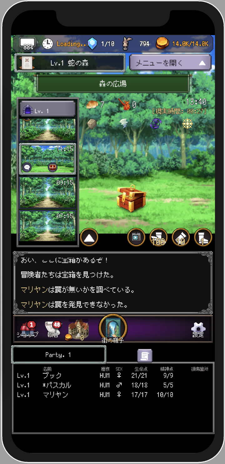 冒険中には様々な宝箱が出現します。 一度しか取れない宝箱や冒険する度に手に入る宝箱など様々です。 それらの宝箱を手に入れて街を発展させましょう!
