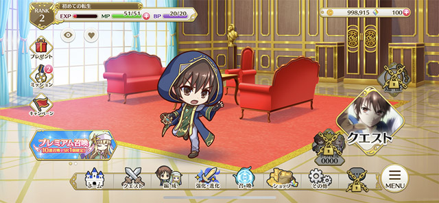 【ホーム紹介】 ゲームプレイの拠点となる画面です。 ホーム画面下部のフッターからは「クエスト」「編成」「召喚」など ゲームの主要な機能を利用できます。 「プレゼントボックス」「ミッション」「お知らせ」の確認も この画面で行うことができます。こまめにチェック!