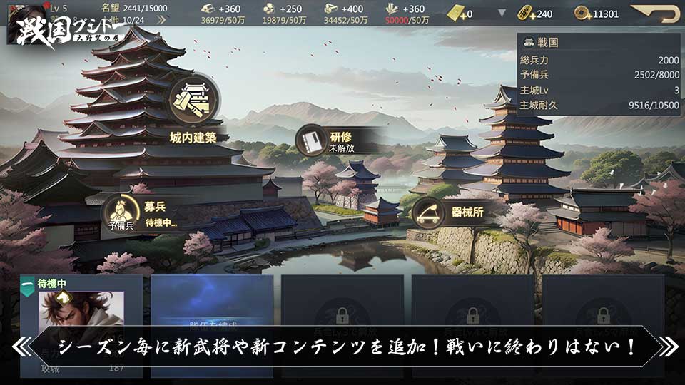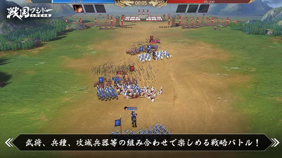 天下布武への道、すなわち「武士道」なり! 戦国時代を駆け抜ける大型歴史戦略SLGが登場! ■シーズン制SLG ・本作はシーズン制を採用しており、プレイヤーは戦国時代を追体験しながら同盟のメンバーと手を組み、シーズン目標に挑戦していく。 ・占領した土地数やシーズン目標の完成数に応じてシーズンランキングが決定される。 ・新シーズンが開始するたびに土地の所属がリセットされ、新たなコンテンツも追加される。また、プレイヤーは所属勢力を再選択できるため、シーズン毎のバランス調整で均衡な対戦環境を楽しめる。 ■自由な行軍システム ・日本地図を駆け巡り、自由な行軍システムでよりスピーディに作戦を展開でき、プレイヤー同士の衝突もより多発になる。 ・攻城戦は敵対同盟の反撃を警戒しなければならない。さまざまなルートから行軍できるため、高戦力のプレイヤーによる戦力の一極集中を軽減し、より多彩な役割分担での協力プレイが可能。 ■奥深い戦略バトル ・武将・兵種・攻城兵器・武技の組み合わせによる戦略バトル! ・9マスの戦場に最大4つの部隊を配置可能。部隊の事前編成による戦略要素が重要視される。 ・兵種には相性関係があり、武将と武技の組み合わせが戦闘結果を大きく左右する。 ・作戦の目的に合わせて、様々な兵器が使用可能。攻城戦は投石機、後方部隊への打撃は弩車、陣太鼓はPK戦、騎兵対策には木慢など、戦略性の高いバトルを楽しめる! ■最高クラスのグラフィック ・最高クラスのグラフィックで戦国武将を魅せる!服装、鎧、武器、全てがハイクオリティ! ・重厚感のある美しいイラストで戦国時代を描く!戦国時代へタイムスリップしたかのような圧倒的な没入感! ■豪華声優陣による熱演(五十音順) ・桑原由気、斎藤千和、佐倉綾音、杉田智和、立花理香、速水奨、福山潤、前野智昭、松岡禎丞など、豪華声優陣が200名以上の戦国武将を熱演!