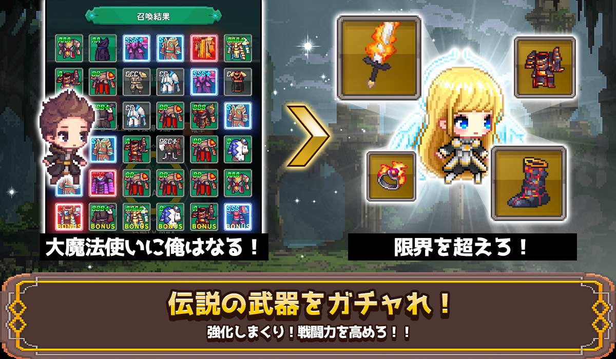 プレイするだけで集まる財貨を使い、最強装備をガチャしよう!モンスターを駆逐する爽快感が止まらない!!