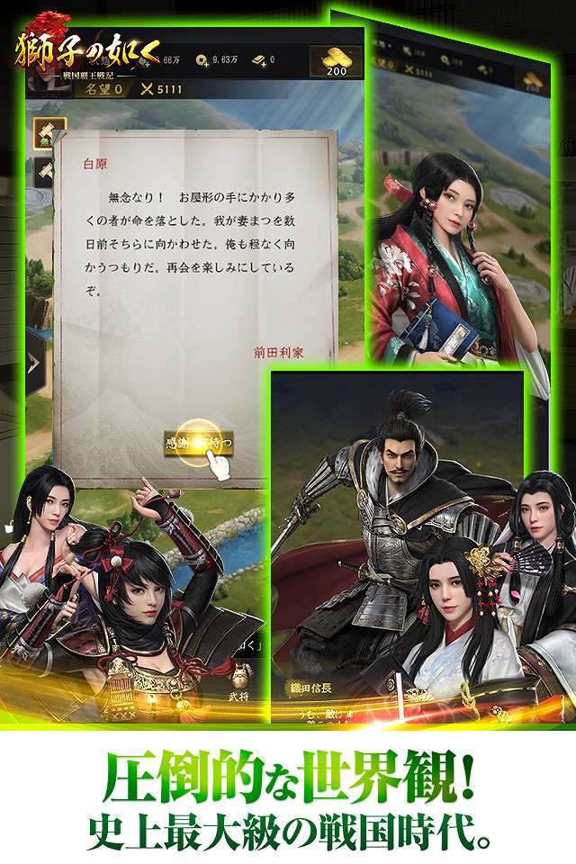 織田信長、毛利元就、明智光秀など、有名かつ魅力的な武将が多数登場! 綿密な考証の元、武将一人一人の魅力を最大限に反映。 様々な個性を持つ武将たちをどう活用していくかはプレイヤー次第。