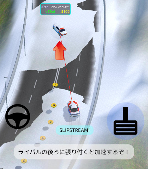 ライバルが前に出てきたら後ろに張り付け! スリップストリームが発動して加速するぞ! ライバルを追い越したら追い越されないようにブロックしよう!
